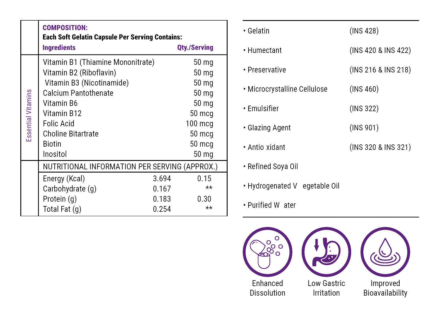Take 1–2 softgel capsules daily. In periods of high stress, exam pressure, intense training or heavy workloads, 2 capsules daily provides maximum B-vitamin replenishment.